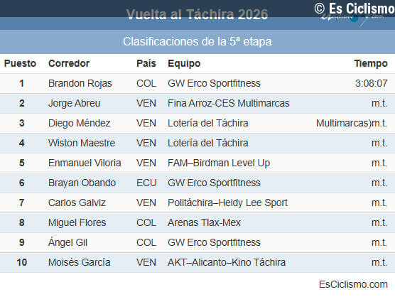 Es Ciclismo13/01/2026 19:47Clasificaciones completas de la 5ª etapa de la Vuelta al Táchira 2026... Leer más en Es Ciclismo