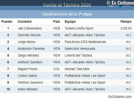Es Ciclismo11/01/2026 18:47Vuelta al Táchira: Colmenares vence al sprint en San Cristóbal y Viloria mantiene el liderato... Leer más en Es Ciclismo