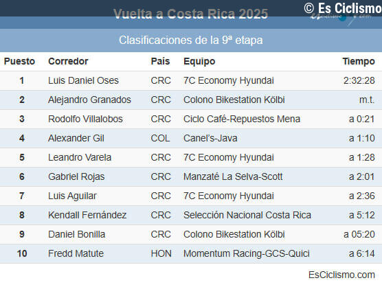 Es Ciclismo20/12/2025 19:47Clasificaciones completas tras la 9ª etapa de la Vuelta a Costa Rica 2025... Leer más en Es Ciclismo