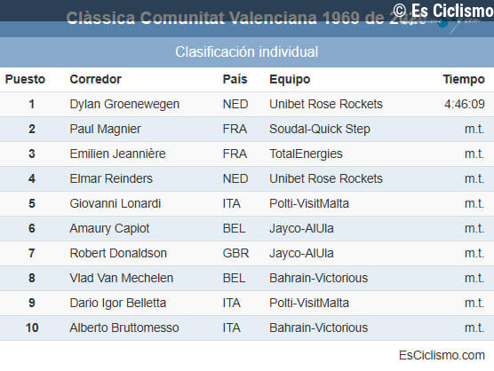 Es Ciclismo25/01/2026 17:47Clasificaciones completas de la Clà ssica Comunitat Valenciana 1969 de 2026... Leer más en Es Ciclismo