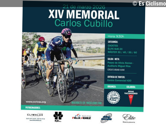 Es Ciclismo11/03/2026 10:30El XIV Memorial Carlos Cubillo reunirá al ciclismo cadete, máster y élite-sub23 en Rivas-Va... Leer más en Es Ciclismo